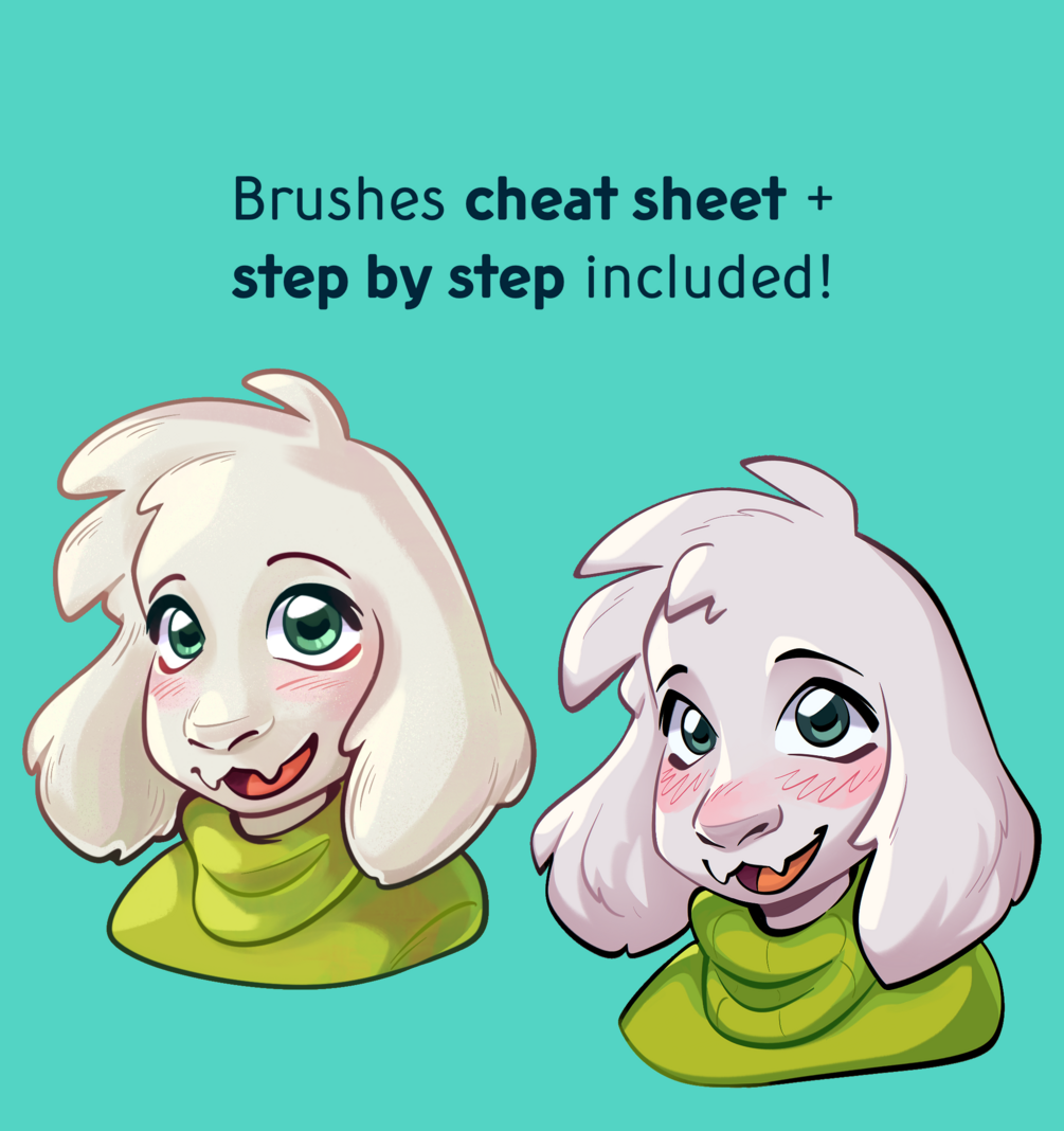 This pack comes with a cheat sheet of how I use each brush, plus a little step by step of a simple drawing, to better illustrate how these brushes can be used.