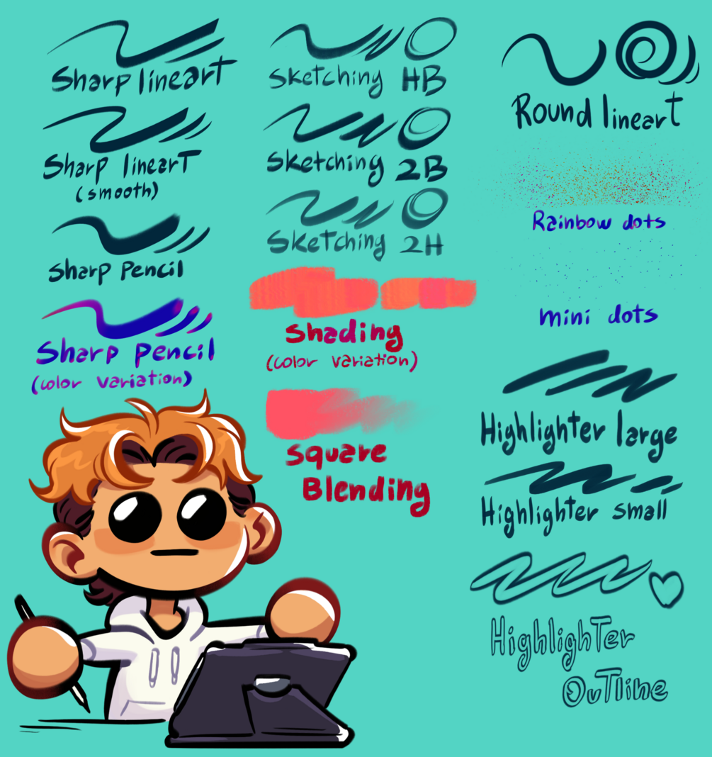 This pack comes with a cheat sheet of how I use each brush, plus a little step by step of a simple drawing, to better illustrate how these brushes can be used.